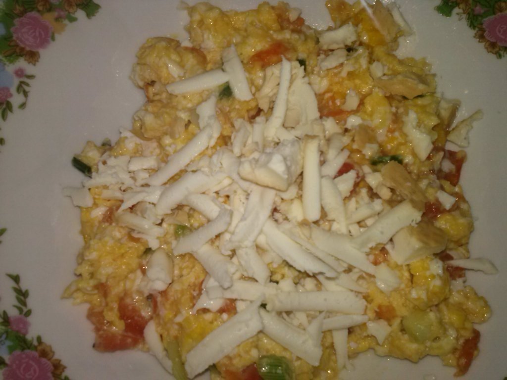 Se incinge uleiul. Se taie ceapa marunt si rosia cubulete. Se calesc pana se inmoaie rosia, dupa care se adauga ouale batute putin in prealabil. Se amesteca bine pana se gateste oul. Se serveste cu cascaval ras deasupra!