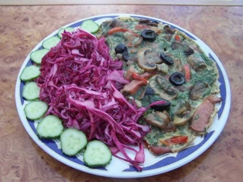 O tigaie de teflon se pune pe foc cu o lingura de ulei de masline, ceapa , ciuperca si sunca. Se inabuse 2 minute, dupa care se adauga ouale batute impreuna maslinele,cu mararul si condimentele.