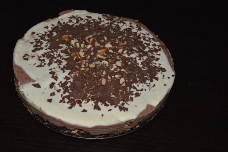 Pisati biscuitii cu fundul unui pahar si amestecati cu untul topit. Cel mai bine amestecati cu mana, este foarte usor si rapid. Asezati amestecul obtinut pe fundul unei tavi cu peretii rabatabili si lasati la rece. Apoi, amestecati ricotta cu ciocolata tartinabila si 200 ml de frisca lichida batuta si adaugati crema astfel obtinuta peste blatul de biscuiti. Peste aceasta adaugati 50 ml de frisca lichida batuta si miezul de la o jumatate de baton de vanilie. Nivelati crema cu o spatula. Aruncati fara mila migdalele si ciocolata rasa.