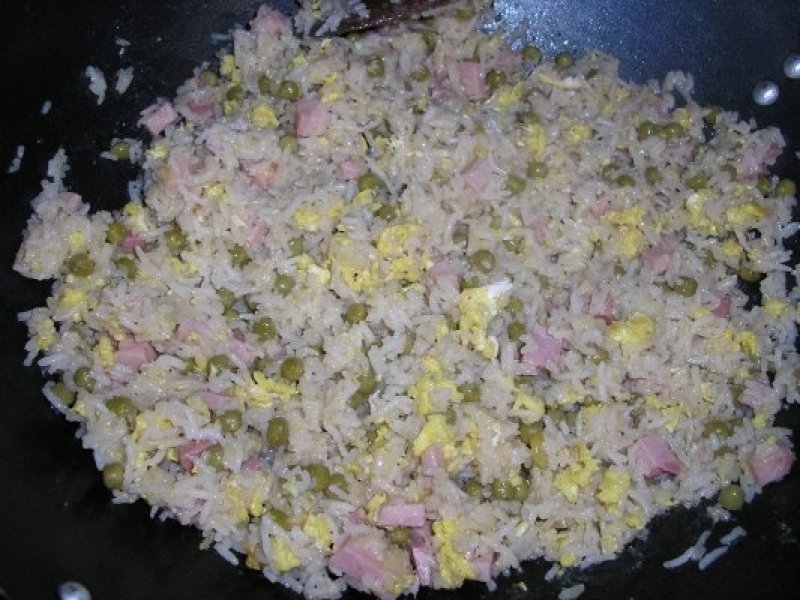 Preparare: fierbem orezul \"al dente\", oparim mazarea, tocam ceapa fin si o impartim in 2. Batem ouale cu sare si cu jumatate din ceapa, pe urma incalzim intr-un wok 2 linguri de ulei, varsam ouale batute si mestecam bine. Ouale trebuie fripte bine. Le scoatem din wok si le lasam pe o farfurie. Cand orezul este fiert \"al dente\" il scurgem si il prajim in wok cu 2 linguri de ulei, ceapa ramasa si sosul de soia. Dam deoparte compozitia si in wok adaugam 2 linguri de ulei in care prajim sunca presata impreuna cu mazarea fiarta. Adaugam si compozitia de orez, oul facut zdrente si amestecam totul bine. Adaugam sare si piper dupa gust. Pofta buna