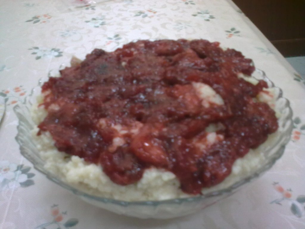 - intr-un bowl se pune putin sos de capsuna dupa care un strat bunisor de orez. Se repeta procesul pina se termina orezul.