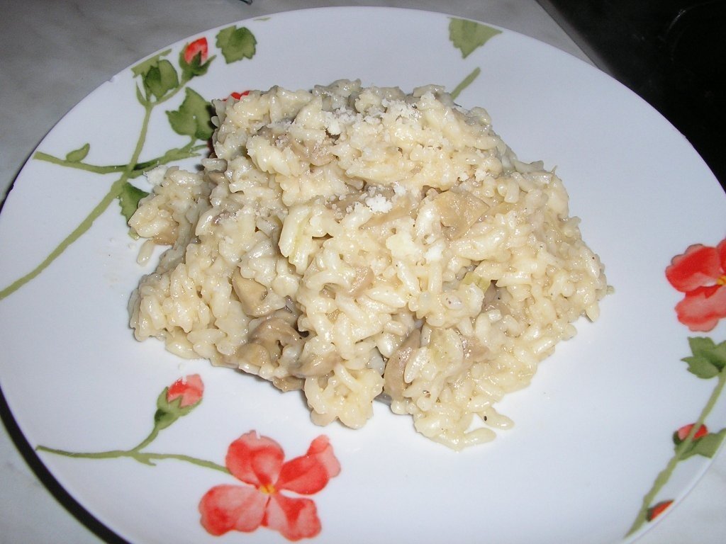 Preparare: Intr-o cratita incinsa cu putin ulei distuim ceapa tocata marunt. Dupa 5 minute adaugam orezul si il prajim putin(1 minut), dupa care il stingem cu vinul alb. Lasam sa se evapore alcoolul si adaugam ciupercile taiate marunt.Adaugam apa si cubul vegetal si continuam sa fierbem orezul pentru circa 15 minute. Apa se adauga cate putina si se mesteca.Dupa 15 minute cand orezul nostru este \"al dente\" se amesteca cu untul si parmezanul devenind cremos....un pic de patrunjel si pofta buna