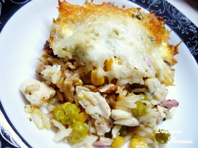 Dupa ce este gata si sosul trecem la pasul urmator si anume, luam un vas termorezistent, il ungem cu putin sos béchamel, punem un strat din amestecul de orez, un strat de sos, cascaval ras, iar orez, apoi sos, cascaval si tot asa pana se termina toate, iar la sfarsit acoperim cu cascaval.