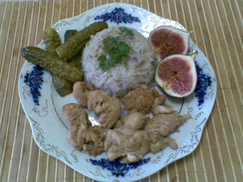 Puiul se serveste alaturi de orez si salata dupa preferinta.