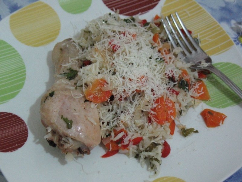 Se spala orezul(eu am folosit orez lung cu timp de fierbere 10 minute) si se amesteca cu legumele taiate dupa preferinta, sare, piper. Se pun toate intr-o tava, deasupra se pun pulpele, se stropeste cu ulei de masline si se adauga apa atat cat sa fie la nivel cu orezul. Se acopera cu folie de aluminiu si se da la cupor jumatate de ora. Se serveste cald cu parmezan razuit.