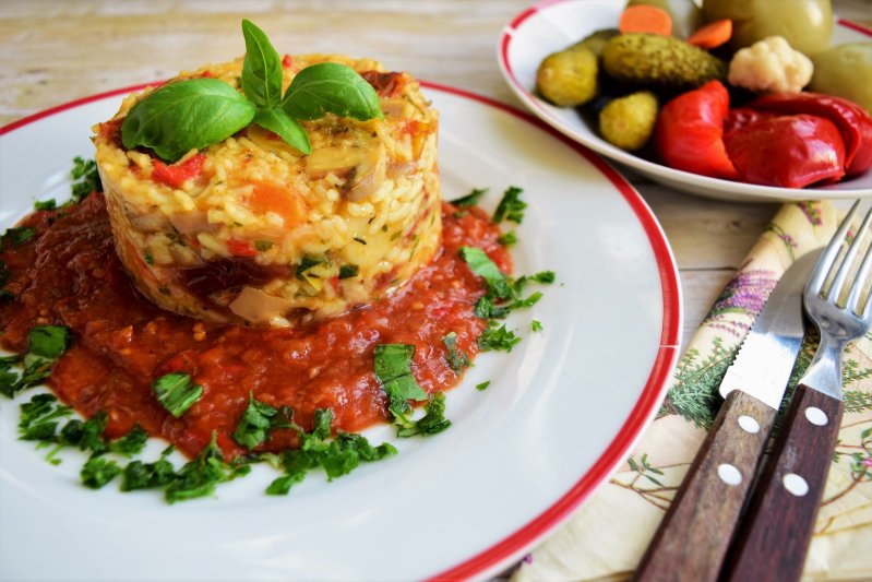Servim mâncarea de orez cu ciuperci, roșii deshidratate și sos de zacuscă, alături de murăturile preferate.