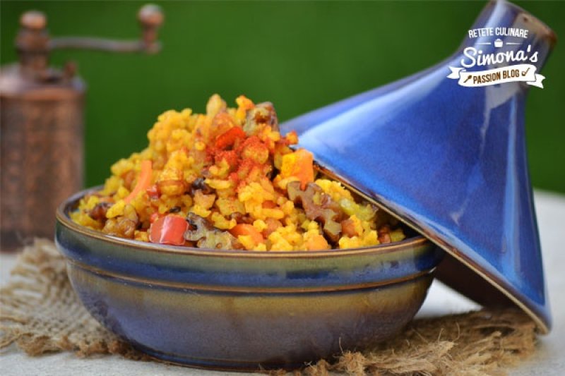 Se adauga orezul, apoi apa astfel incat sa acopere ingredientele din tigaie, se condimenteaza cu sare, scortisoara, cardamom, baharat, boia de ardei iute se amesteca si se lasa sa fiarba la foc mic.