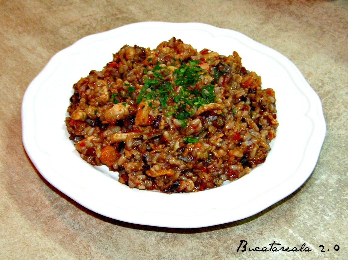 Intre timp se pune la incins o tigaie antiaderenta incapatoare. Se pun in tigaie una, doua linguri de ulei, iar cand acesta s-a incazit usor se adauga si ceapa. Se caleste putin, doar cat sa se inmoaie. Se adauga carnea, se rumeneste, dupa care se adauga si morcovii. Dupa aproximativ 5 minute se adauga si pasta de ardei si dulceata. Se stinge totul cu apa fierbinte (cat sa acopere ingredientele din tigaie) si se lasa sa fiarba innabusit. Daca dupa ce scade apa, carnea nu este suficient de moale (dupa cum spuneam, avea fibra cocosul meu, nu gluma), se mai adauga niste apa fierbinte. Se repeta toata treaba pana carnea este fix pe gustul nostru. Oricum, la final mancarea nu trebuie sa mai aiba zeama, ci chiar sa se rumeneasc usor bucatelele de carne si legumele. In acest moment se adauga si orezul fiert si foarte bine stors. Se mai lasa cateva minute pe foc, cat sa se imprieteneasca bine, iar la final se adauga si patrunjelul tocat.