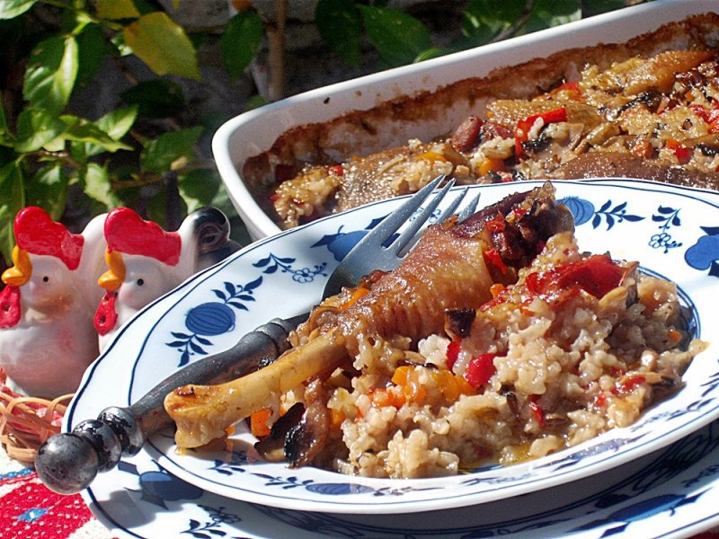 Se toarna orezul cu legumele intr-o tavita mai inalta, se aseaza carnea fiarta de cocos, se toarna si supa oprita si se da la cuptor cca 20-30 minute,pana scade toate supa. Se presara verdeata tocata deasupra.