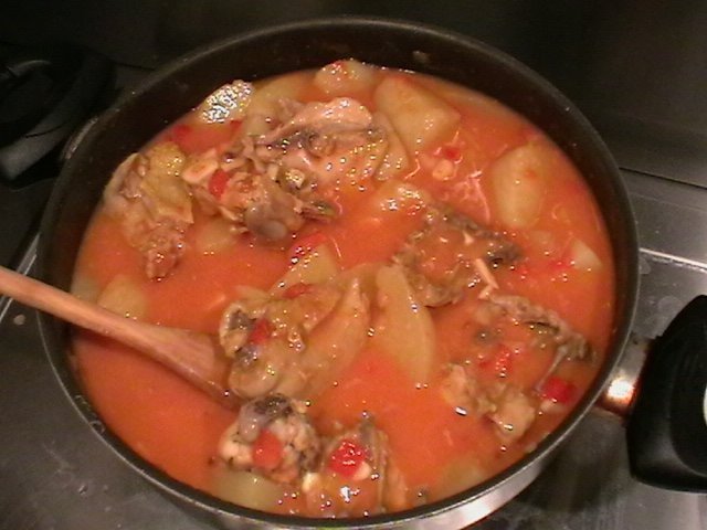 Intr-o cratita se caleste ceapa, si cand devine sticloasa se adauga ardeiul. Dupa ce s-au calit, se adauga bucatile de pui si cartofii, cu doua cani din zeama de carne.