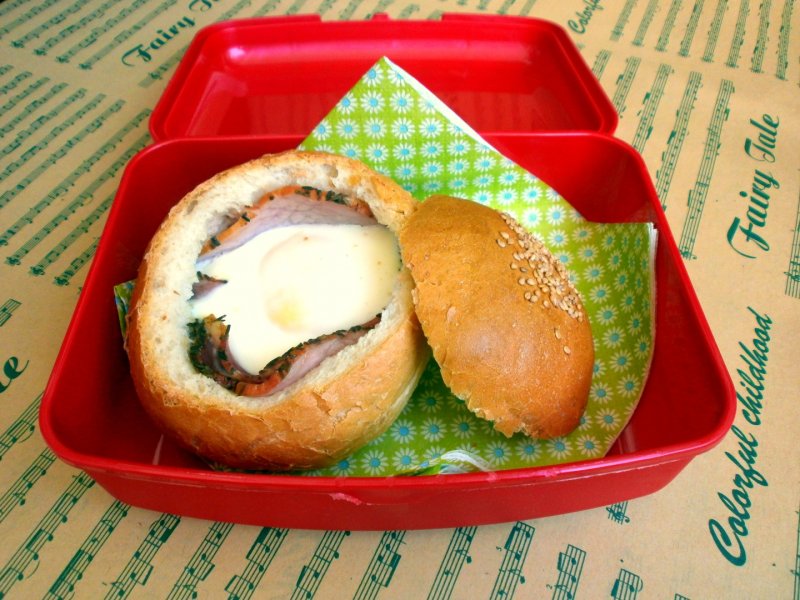 Se taie un capac la chifla si se scobeste de miez, se pun feliile de muschi tiganesc in interior, apoi se pune oul si putina sare. Se pune capacul la chifla si se impacheteaza in hartie de aluminiu. Se baga la cuptor circa 30 de minute, dupa care se poate servi sau se poate lua la pachet.