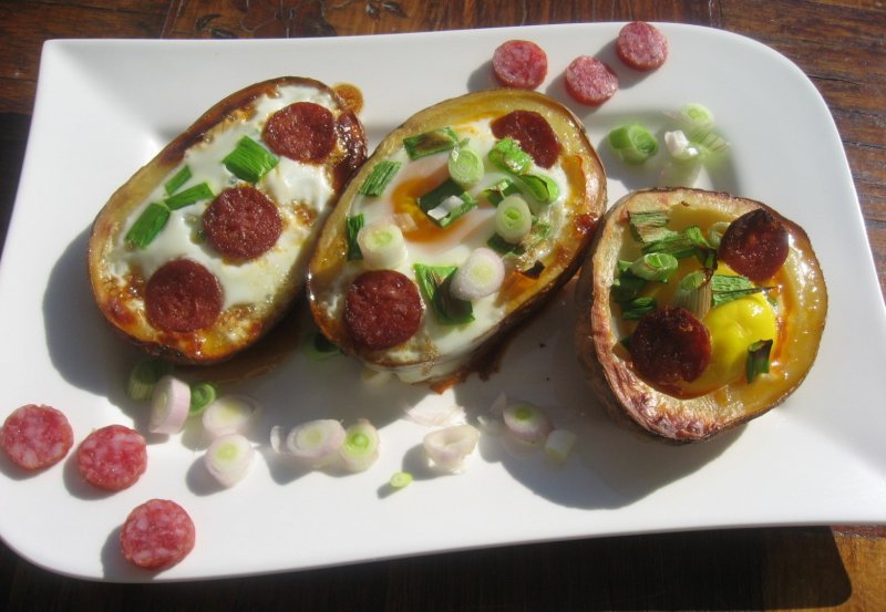 Asezonam cartoful cu sare si piper, punem putin unt, branza si cateva firicele de ceapa verde . Spargem oul in mijlocul cartofului , aranjam felii de carnat si dam la cuptor pana cand se coace oul (8 - 10 minute).