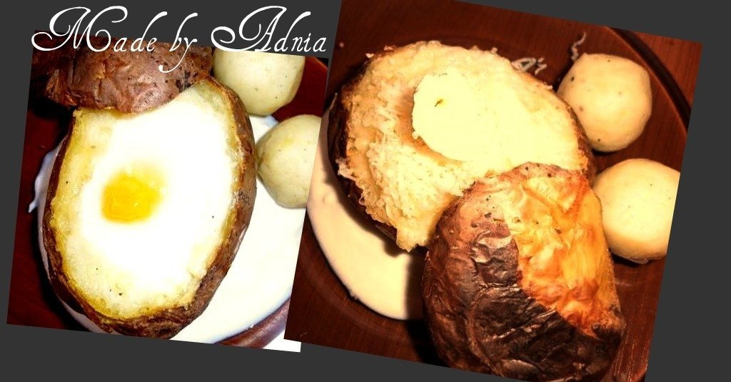 Am copt cartofii 1 h si 30 min, pana s-au inmuiat bine, apoi i-am lasat cateva min sa se racoreasca, apoi i-am taiat orizontal in partea de sus , formand un capacel. am scobit continutul cu o lingurinta, lasand peretii cartofilor grosi de 1 cm. am condimentat pe dinauntru, apoi am trecut la formarea umpluturii: din continutul cartofilor am facut un piure delicios, adaugand unt, sare si piper. Cu acest piure am umplut din nou cartofii, avad totusi grija sa las o gaura in mijloc pr oua. Am spart ouale in iteriorul cartofilor, apoi le-am pus capacelele la loc si i-am dat la cuptor pt. 10 min, pana s-au copt ouale. Dupa acest pas, am scos capacelel cartofilor si am decorat cu cascaval ras si unt. Din piureul ramas am format 2 bilute, pe care le-am asezat ca decor pe farfurie. Am servit cartofii fierbiti, pe pat de iaurt.
