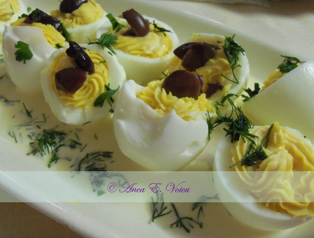 Sosul il facem din: 2 lingurite de maioneza, zeama de lamaie si il subtiem cu putin apa. Turnam sosul peste oua si se decoreaza cu marar si patrunjel si masline.
