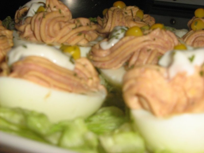 Punem ouale la fiert cu putina sare ,15 min. Le scoatem le dam printr-un jet de apa rece si le decojim le scoatem galbenusul si le amestem intr-un bol cu conservele de porc, maioneza sarea si putin piper pana devine o pasta , apoi umplem ouale le ornam cu patrunjel si boabe de porumb fiert.Le asezam pe platoul deja decorat cu frunze de salata si cateva felii de Jambon peste le punem putin patrunjel uscat sau verde.Apoi le dam la rece .Pofta Buna!