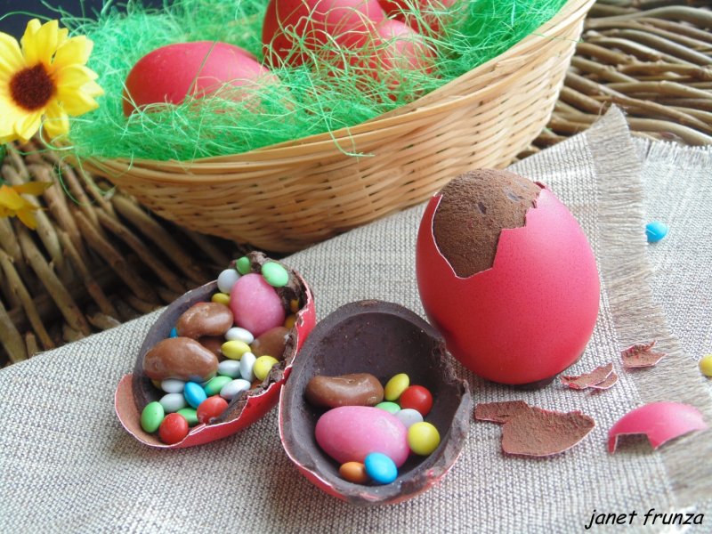 Ca sa le pun cate un capacel ciocolata ce am imbracat cojile, am lasat-o sa se raceasca, aproape de tot, si apoi am luat cate o lingurita de ciocolata si am inchis ouale. (ciocolata nu trebuie sa fie prea fluida, altfel s-ar prelinge peste bomboane si le-ar inchega).