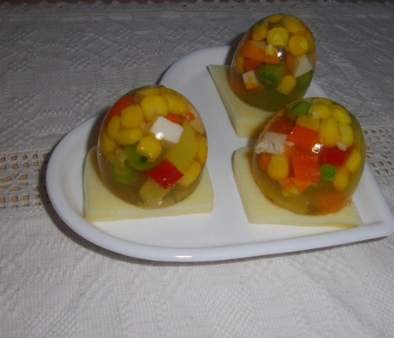 Umpli cojile de oua cu legume ,piept de pui si cascaval,cam 1/3 si completezi cu supa. Lasi ouale la rece cca 2 ore, dupa care le decojesti cu grija.