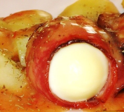 Ouale "imbracate" in bacon se servesc stropite cu acest sos si cartofi natur.