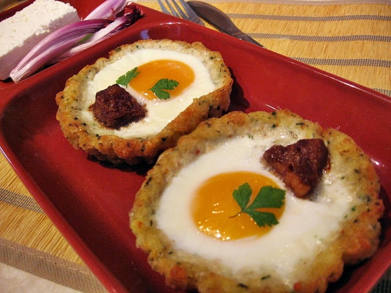 Punem un strat destul de gros, lasam loc doar cat sa incapa un ou. Asezam cate o jumara in cuibul format si spargem cate un ou peste ea. Presaram sare deasupra oului, asezam formele intr-o tava(mie mi-a fost teama sa nu cada din compozitie daca asez formele direct pe gratar, pentru ca am modelat cosuletul ceva mai inalt decat peretii minitartei) si dam tava la cuptor pentru 15 minute la 180 grade, sau atat cat sa se formeze crusta deasupra oului.