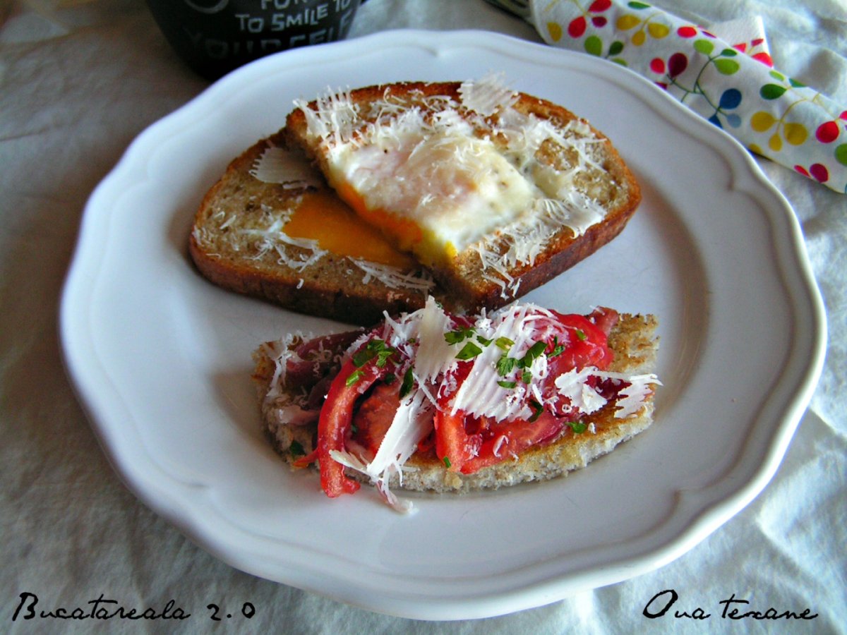 Mijlocul painii se prajeste mai repede, astfel ca pana este gata oul ne putem ocupa de el. Se garniseste cu ce se doreste sau cu ce se gaseste prin frigider. Noi am pus niste sunca afumata, rosii, fulgi de parmezan si putin patrunjel. Pe langa gustul bogat, ii da si o culoare frumoasa farfuriei.