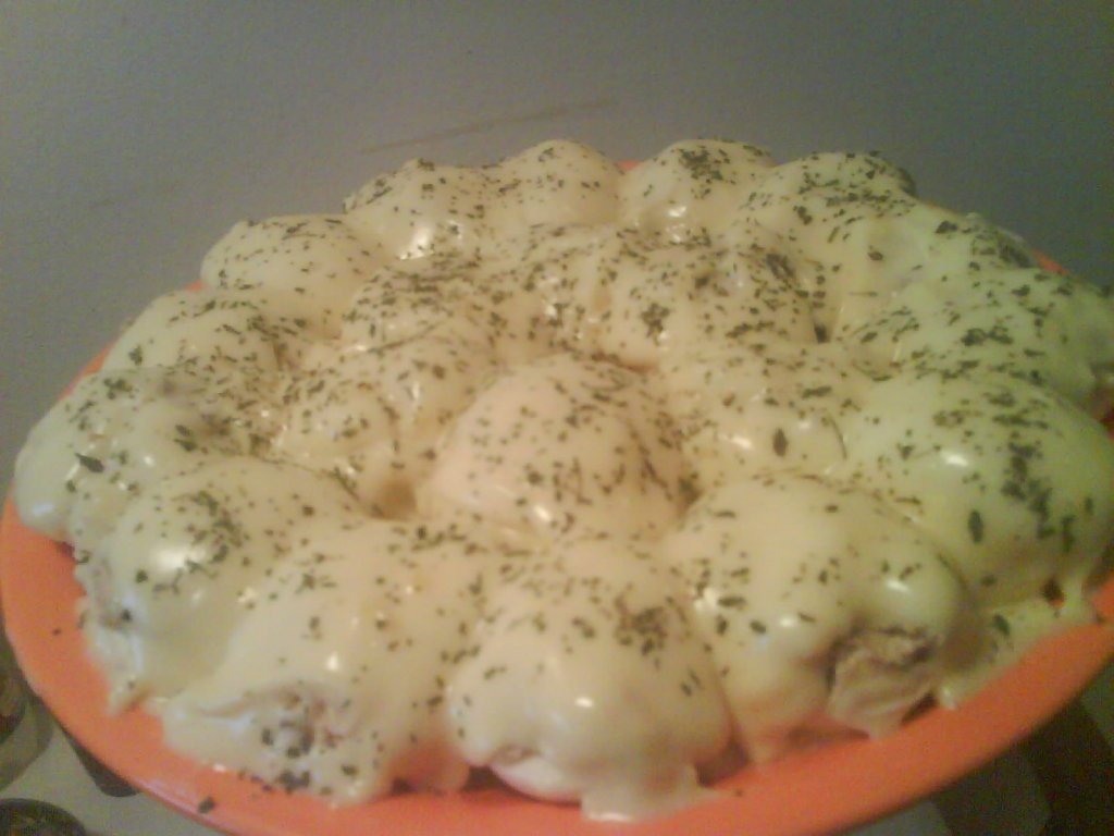Dupa ce ati pus ouale pe platou se toarna deasupra cat mai estetic maioneza ramasa, amestecata cu 2 linguri de smantana (pentru a deveni mai fluida si mai usor de lucrat cu ea).