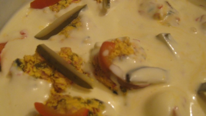Se amesteca pasta de galbenus cu celelate ingrediente taiate, obtinandu-se o noua compozitie cu care umplem ouale.