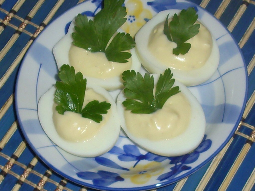 Ouale se fierb in coaja, dupa ce s-au fiert se tin pentru citeva minute in apa rece pentru a putea fi decojite mai usor. Se decojesc, se taie jumatati, se scoate galbenusul si se faramiteaza bine, se amesteca cu maioneza, sare si piper dupa gustul fiecaruia si se mixeaza bine pana obtinem o pasta fina. Cu aceasta se vor umple albusurile. Se decoreaza cu patrunjel.