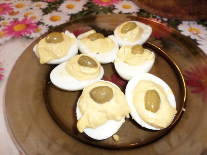 Se scoate galbenusul tare intr-o farfurie si se zdrobeste, se adauga putin ulei se freaca bine si se adauga putin mustar si maioneza. Se amesteca bine totul, se asoneaza cu sare piper.Nu trebuie mult, mustarul este destul de sarat. Cu aceasta umplutura umplem ouale cu o lingurita si le ornam dupa dorinta.Le putem decora cu bucatele de masline, ardei sau castravete murat taiat fasii subtiri.