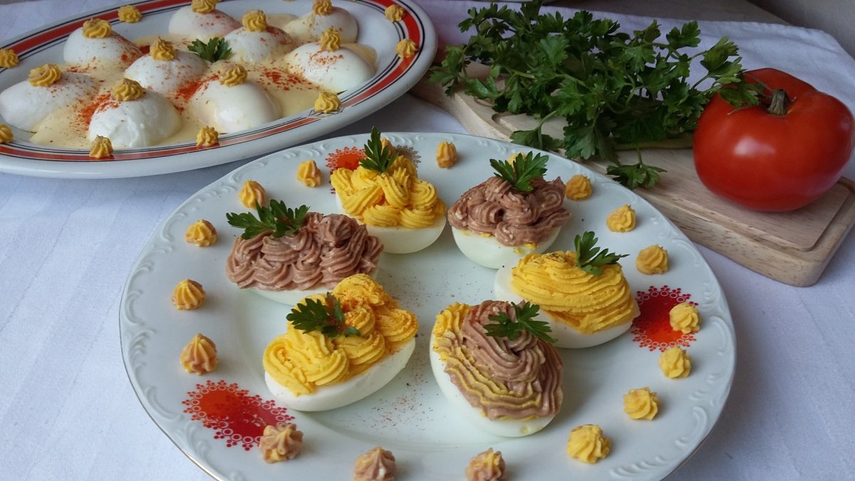 Se ia o parte din jumatatile de ou si se umplu cu cele doua creme, apoi se aseaza pe un platou cu partea bombata in sus.