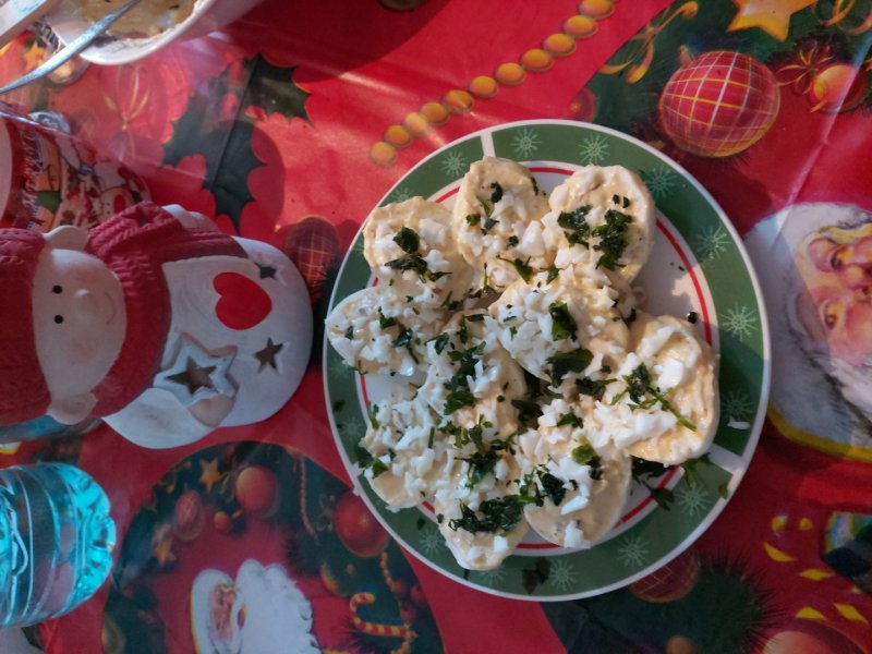 Apoi fie torn maioneza peste jumatatile de ou umplute si asezate pe platouri(de obicei fac cel putin doua platouri, in functie de cate “ture” de musafiri voi avea), fie o asez intr-un caston pe marginea platoului pentru a se servi cine doreste din sosul respectiv)Ornez si cu masline si patrunjel.