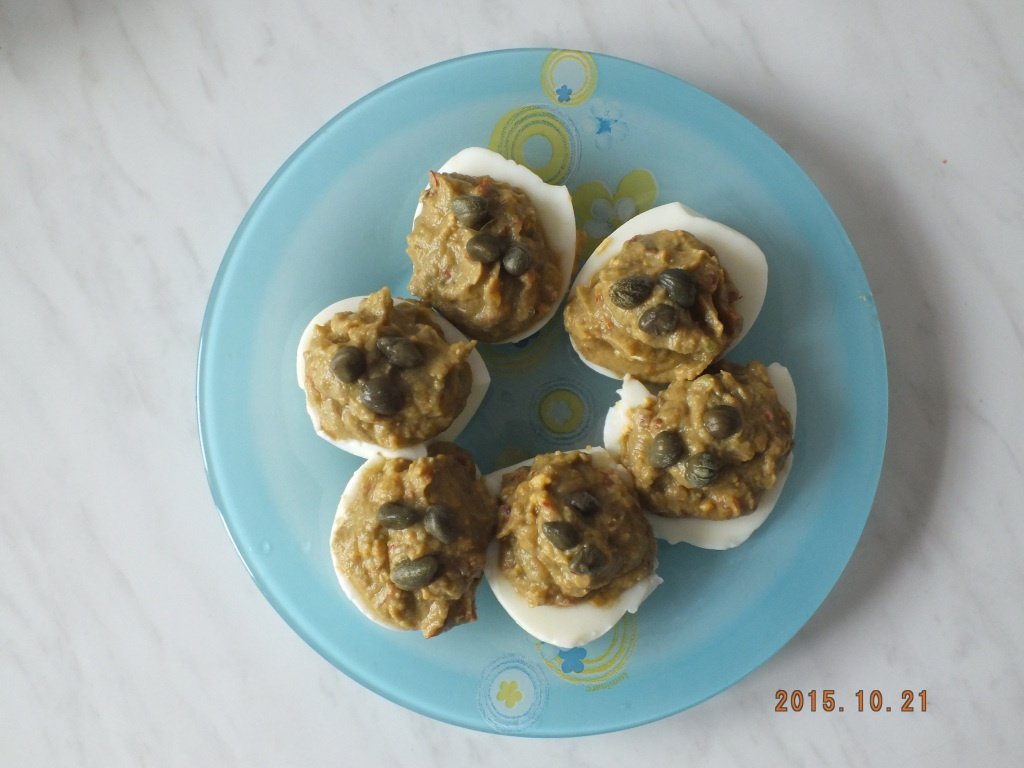 Se fierb ouăle tari, se curăţă şi se taie pe jumătate. Se curăţă de coajă fructul de avocado şi se scoate sâmburele. Roşia se curăţă de pieliţă şi de sâmburi. Cu o furculiţă se face pastă miezul de avocado şi roşia. Se adaugă ceapa tocată mărunt, sucul de lămâie, coriandrul, sarea şi pasta de ardei iute şi se amestecă bine cu furculiţa. Se scot gălbenuşurile, se mărunţesc şi se amestecă cu pasta de avocado. Jumătăţile de ou se umplu cu această pastă şi se ornează fiecare cu câte 2 - 3 capere marinate.