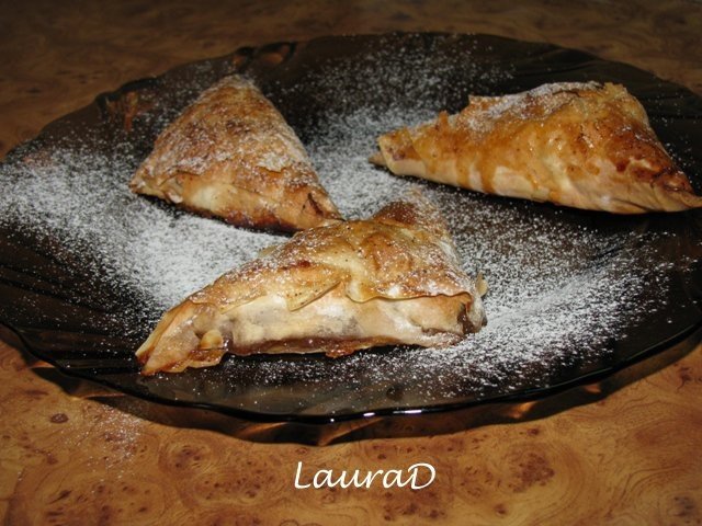 Amesteca untul topit cu 50 ml lichior de ciocolata.Taie foile de placinta in 3 parti pe lungime.Unge fiecare foaie cu unt topit aromat.Pune o lingura de amestec cu mere la capatul fiecarei fasii de aluat si impacheteaza fiecare fasie astfel incat sa obti un triunghi.Aseaza triunghiurile formete intr-o tava de copt si da-le la copt 15-20 minute pana cand s-au rumenit si au devenit crocante.