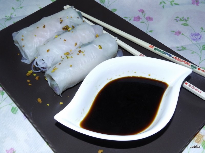 Morcovii curatati, spalati se oparesc 3 minute in apa cu putina saresi ceapa. Taiem morcovii in fasii subtiri, ceapa in semilune si le lasam deoparte pe o farfurie. Inmuiem foile de orez cateva secunde in apa putin fierbinte, dupa care le scoatem pe un tocator si le ungem cu pensula cu lapte de cocos. Asezam pe fiecare foaie cateva paste de orez tinute intr-un castron cu apa fiarta 3 minute,4 bucati de morcov, 2 semilune de ceapa, si le rulam in forma de pachetel. Deasupra se presara migdale sau fistic taiat cu cutitul.