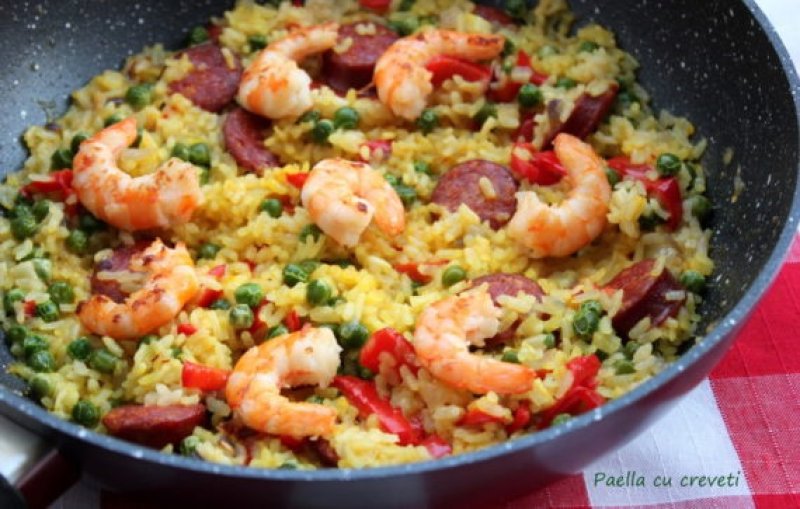 Separat, se rumenesc creveții câteva minute, în puțin ulei de măsline și un cățel de usturoi, tocat. Se dau deoparte și se așază peste paella (eu am preferat să îi curăț), dar se pot pune întregi.