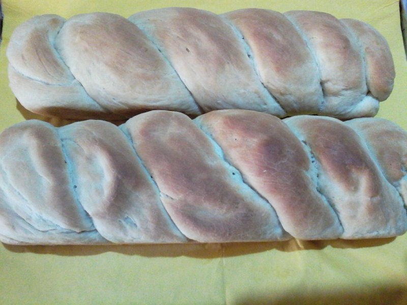 Tapetati cu hartie o tava (eu doar am uns tavile cu unt, deoarece sunt tavi care nu lipesc) si rupeti aluatul in doua, iar fiecare parte iar in doua. Faceți suluri pe care le împletiți. Puneți pâinea in tava si mai lasati sa creasca pana aluatul ajunge in margineaza de sus a tavii.