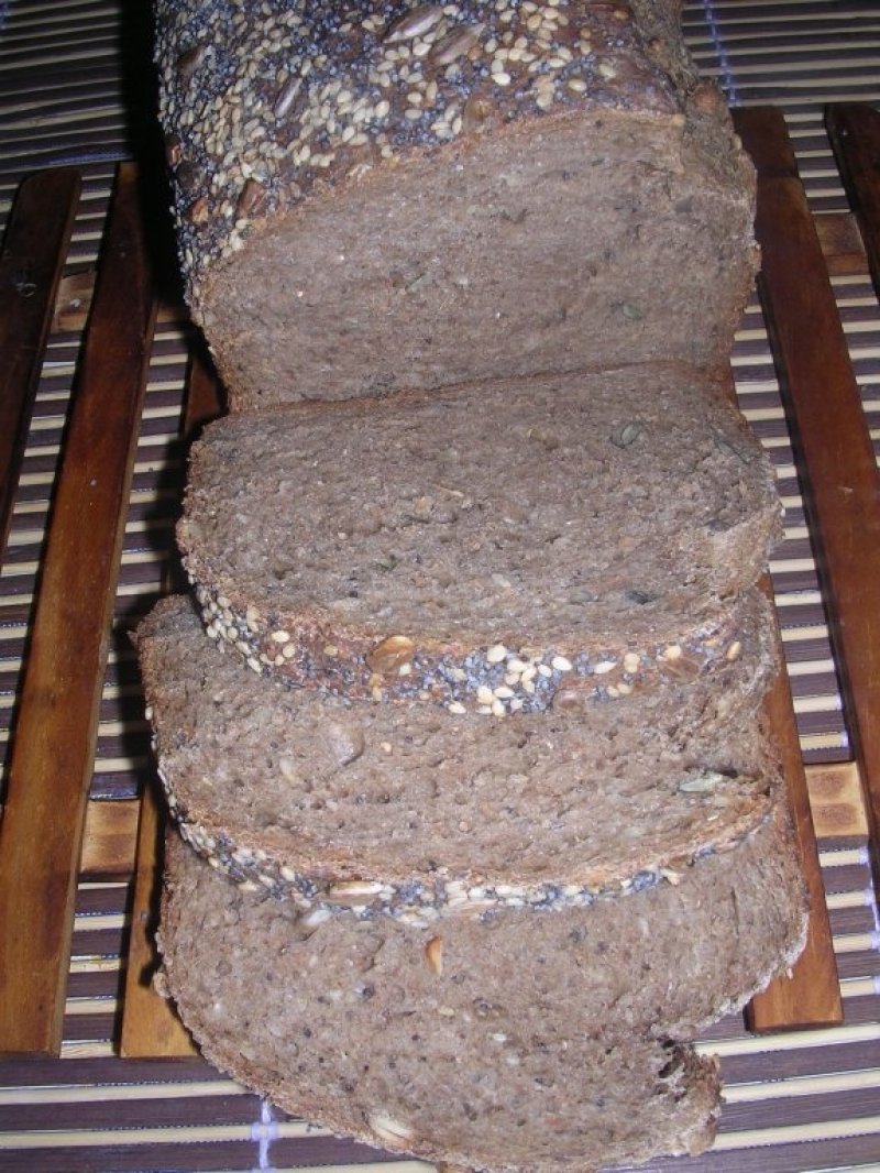 Cand a fermentat o punem peste faina in care am amestecat semintele si 1/2 lingurita de sare.Adaugam apa calda putin cate putin si framantam continuu timp de 15 min.La sfarsit adaugam 2-3 linguri de ulei de masline,inglobam si lasam la crescut cam o ora.Dupa ce a crescut ,o punem intr-o forma,tava,...,lasam inca vreo 20 min sa mai creasca,presaram pe deasupra seminte de care vrem si coacem cam 35-40 de minute la foc moderat.Pofta buna!