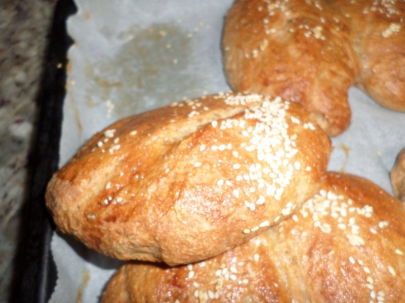 Impartim aluatul in 12 bucati si facem painicele dupa dorinta le punem la distanta unele de altele si mai lasam jumatate de ora sa creasca. Le ungem cu ou batut cu putina sare si presaram cu susan - nu este obligatoriu ou se pot stropi cu putina apa si presarat cu susan sau cenusca si tot e bine.