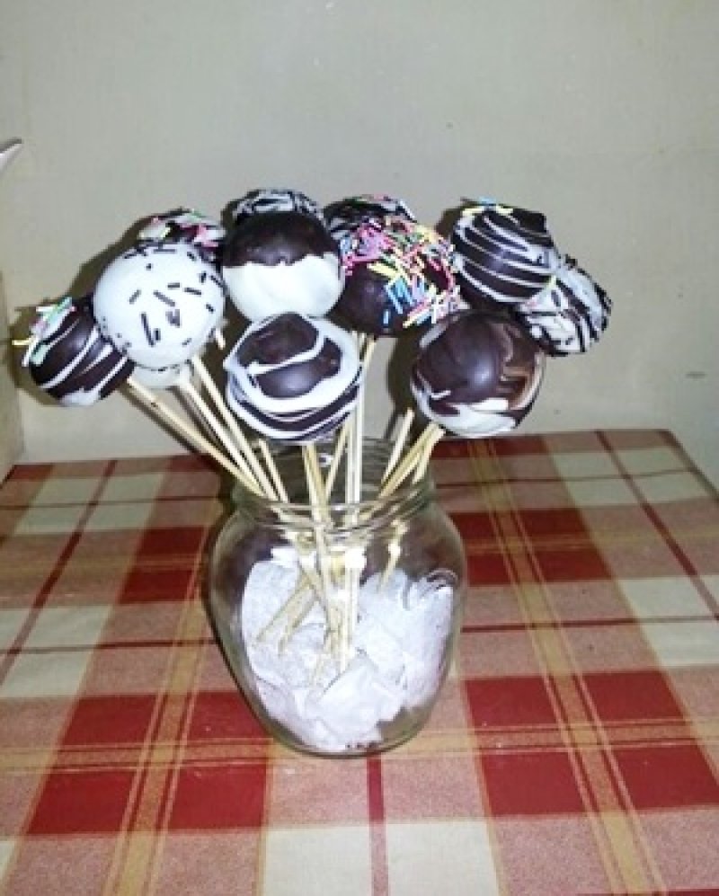 Se sfarma biscuitii (folosind robotul va fi foarte rapid). Se adauga mascarpone si se amesteca. Trebuie sa obtineti o pasta omogena. Din aceasta se formeaza bile (ies aproximativ 16 bucati din aceasta cantitate). Se pun in tava. Se intoduc betele de frigaruie in bile (aproximativ 1 cm adancime) si se pun in frigider pentru 30-40 minute.