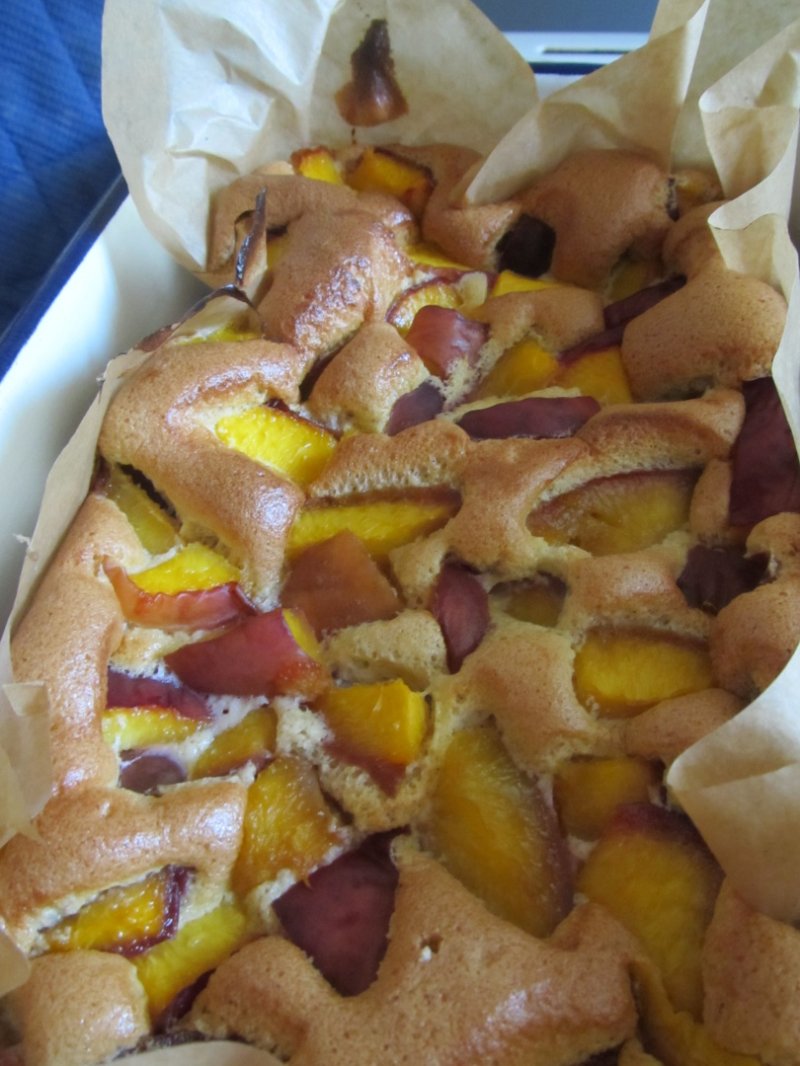 Punem aluatul obtinut intr-o tava " tapetata" cu hartie de copt. Adaugam deasupra nectarinele. Introducem tava in cuptorul incalzit in prealabil pentru aproximativ 30 de minute la foc mic - mediu in functie de cuptorul fiecaruia. Se lasa pana la testul scobitorii, insa evitati sa deschideti de foarte multe ori cuptorul. :)