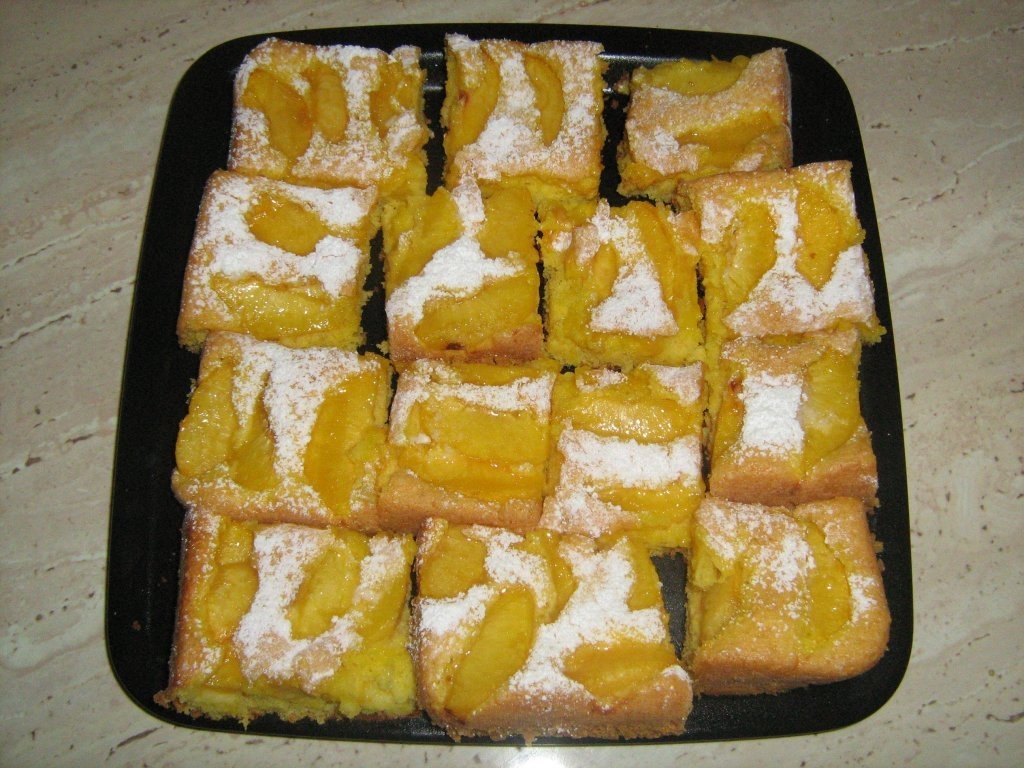 Se adauga piersicile taiate feliute subtiri si se da la cuptor. Se pudreaza cu zahar.