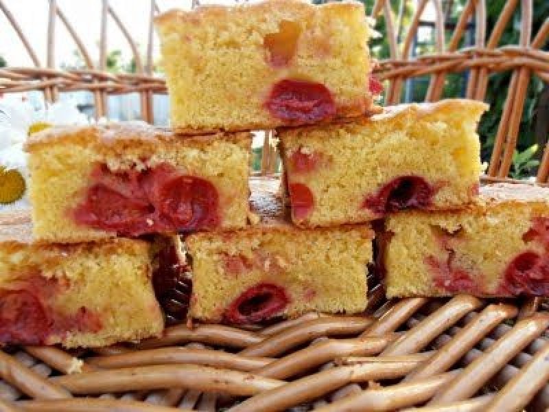 Scoatem samburii visinelor si le lasam la scurs (pot fi folosite si din compot sau congelate). Batem ouale cu zaharul pana ce se topeste zaharul. Tapetam o tava cu hartie de copt si turnam compozitia. Presaram visinele cu faina si le punem din loc in loc. Dam la cuptor la foc mic pana se rumeneste usor deasupra. Lasam sa se raceasca apoi taiem cuburi.