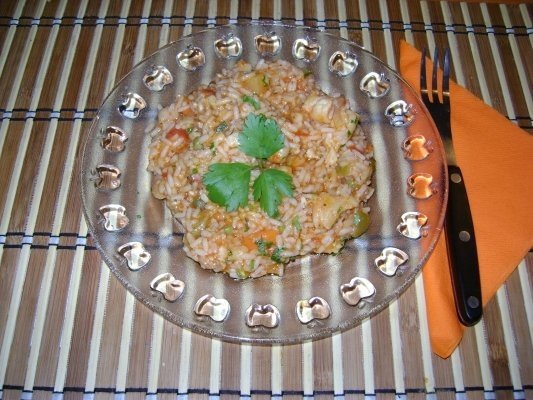 Intr-o cratita se pune uleiul de masline la incalzit. Se adauga usturoiul si pangasiusul si se prajeste.Adaugam rosii,capere,legumele,oregano si lasam sa fiarba 10 minute la foc mic. Punem orezul si apa cu vinul(1:3), condimentam cu sare, piper si oregano dupa gust si terminam fierberea.