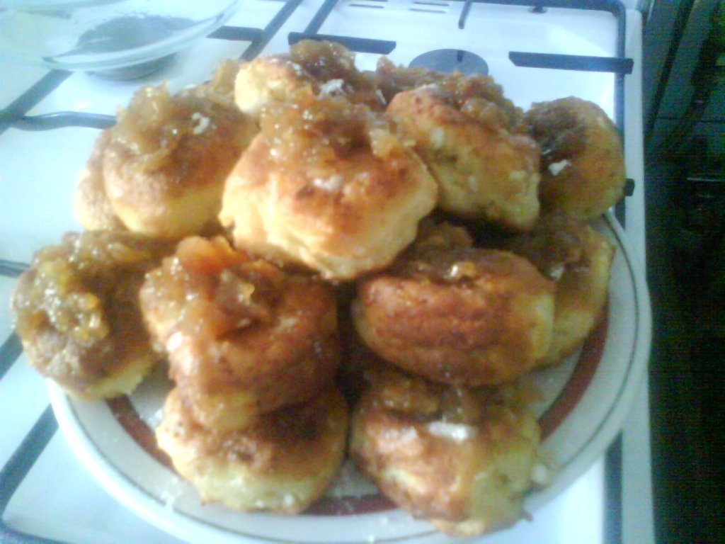 Pe o folie se presara putina faina si se fac cu mainile umezite in apa gogoloaie de cca 5-6 cm diametru,pe mijlocul lor se fac gauri unind policele(degetul mare) cu aratatorul pe mijlocul gogoloiului,largind apoi putin gaura.Se lasa pe folie vreo 5 min sa se odihneasca.Intr-o tigaie se pune ulei , cca 2 cm,sau mai mult se lasa la infierbantat apoi se aseaza papanasii.Se prajesc pe ambele parti la foc relativ mic.Dupa ce se scot se pudreaza cu zahar pudra si se aseaza pe mijlocul lor cate o lingurita de dulceata de mere. Cand le scoatem din tigaie sunt un pic tari la coaja,dar se inmoaie pe masura ce se racesc.Pofta buna!