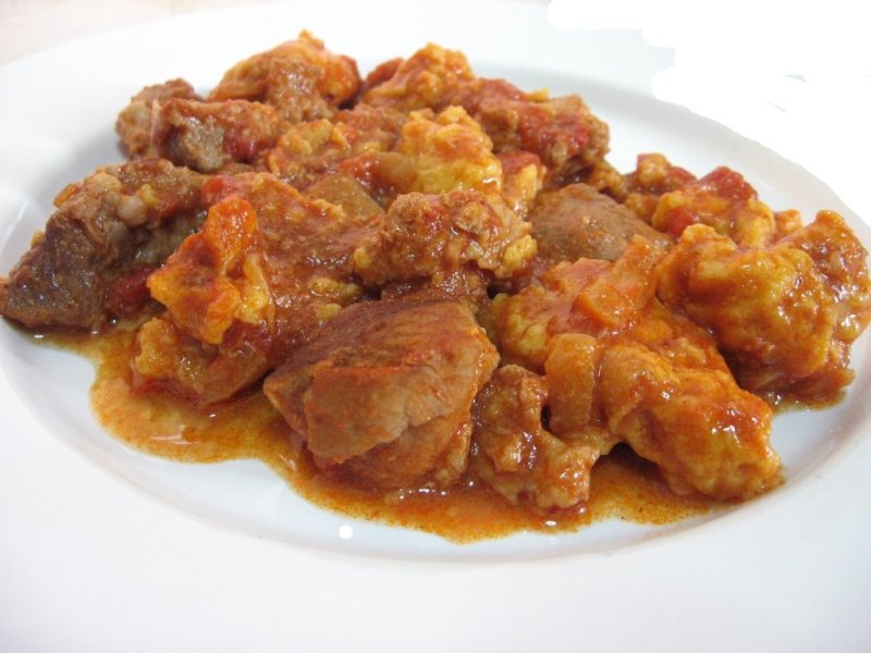 Carnea de porc o tăiem bucăţele potrivite şi o punem la rumenit în ulei de floarea soarelui, cît să se albească frumos pe toate părţile. Scoatem carnea şi în zeama lăsată punem ceapa tăiată mărunt şi o călim până devine strălucitoare. Apoi punem boiaua de ardei dulce şi repede turnăm o cană de apă. Avem grijă ca boiaua de ardei să nu se caramelizeze când o punem peste ceapă, ea are tendinţa de a se arde imediat, fapt care-i va schimba gustul. Punem carnea şi ardeiul tocat mărunt, apoi turnăm cealaltă cană de apă şi adăugăm şi frunza de dafin, usturoiul tocat, delikat şi boiaua de ardei iute/chili.