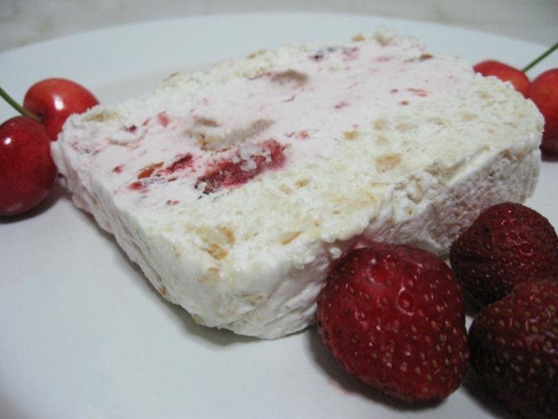 În forma de chec unsă cu ulei/grăsime şi tapetată cu folie alimentară, puneţi jumătate din cantitatea de parfait cu biscuiţi. Daţi la congelator pentru 45 minute. Scoateţi apoi tava din congelator şi puneţi amestecul de parfait cu căpşuni şi cireşe albe (cu fructe) şi daţi iar la congelat pentru alte 45 minute. Apoi turnaţi deasupra restul din cantitatea de parfait cu biscuiţi şi lasăţi la congelat pentru minim 6 ore.