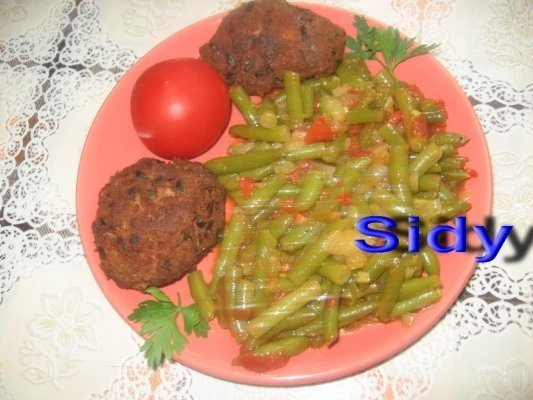 2 cepe verzi se toaca marunt si impreuna cu ardeiul gras si rosia taiate cubulete se calesc in putin ulei apoi se adauga fasolea verde. Punem o canita cu apa , sare , piper si lasam sa fiarba acoperit.