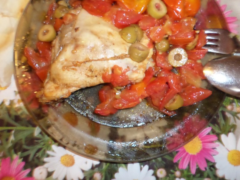 Se spala bine pasarea se scoate pielita caci nu ne trebuie grasimea ei si o punem in punga adaugam rosiile cu sosul lor maslinele mirodenii, usturoi .