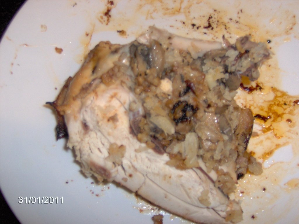 Intr-o tigaie incalzim ulei de masline prajim putin ceapa adaugam ciupercile taiate feliute si le calim impreuna cu ceapa.Se prajeste putin si se ia deoparte sa se raceasca dupa care se amesteca cu orezul fiert si scurs de apa.Se da la gust cu sare si piper si se amesreca cu un ou .Cu aceasta umplutura se umple gaina bine si se inchide burta cu scobitoare sau se coase cu ata.Se leaga picioarele cu ata.