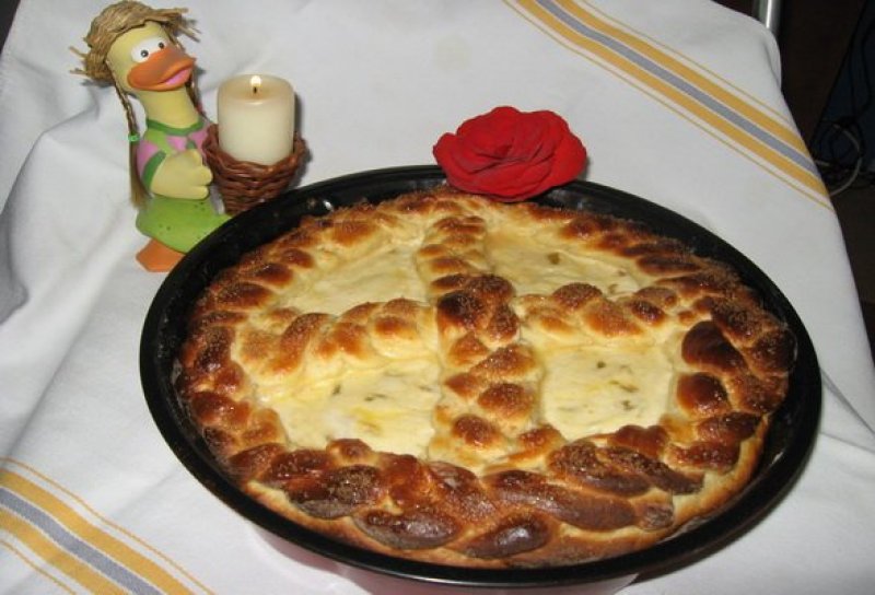 Am amestecat toate ingredientele pentru umplutura intr-un bol (stafidele le-am spalat cu apa rece si le-am lasat in apa cam 15 minute, sa se umfle putin). Am pregatit o forma rotunda, cam 26 cm diametru, unsa cu ulei si tapetata cu faina. Aluatul l-am intins si am imbracat forma, plus peretii, apoi am turnat umplutura de branza si am taiat cu un cutit marginile de aluat, lasand sa ajunga doar pana la nivelul umpluturii. Apoi am impletit fasiute de aluat si am ornat de jur imprejur plus o cruce pe mijlocul formei.