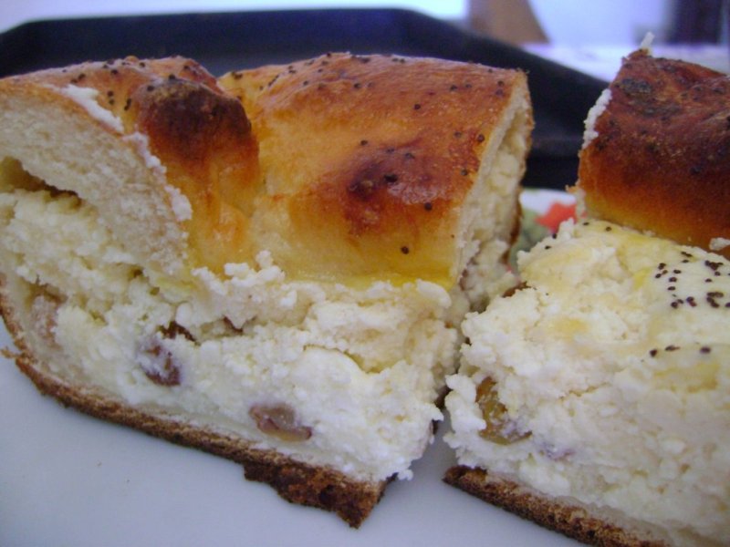 Branza de vaci se scurge de apa intr-o sita marunta si se amesteca cu galbenusurile de ou, untul topit, smântana, zahar, sare, coaja de lămâie, zahar vanilat si stafidele spalate si inmuiate in apa. Se amesteca bine. Se adauga, faina, gris, si dupa ce se amesteca bine si pune umplutura in forma in care ati asezat aluatul, ca intr-un cosulet.Se unge cu ou. Pe deasupra umpluturii se poate se pot pune aluat rasucit de grosimea unui creion, asezat in forma de grilaj.